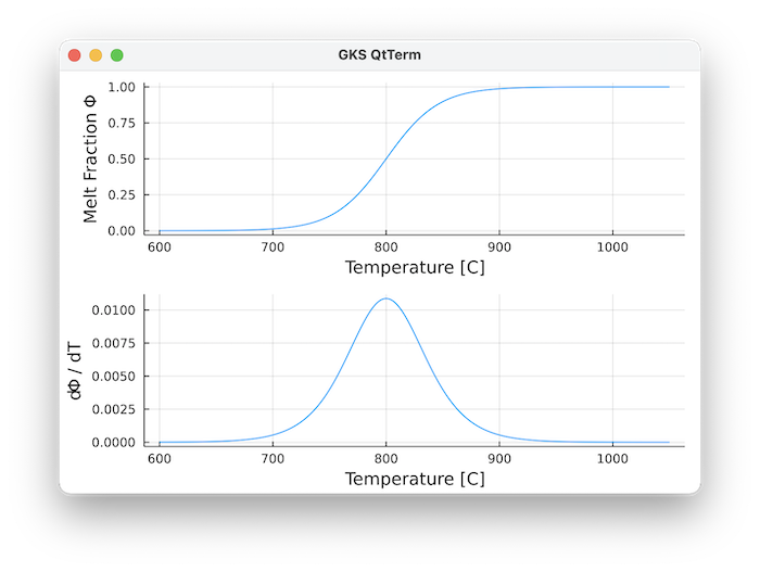 julia> T,phi,dϕdT = PlotMeltFraction(p,T=T);The same but with smoothening: