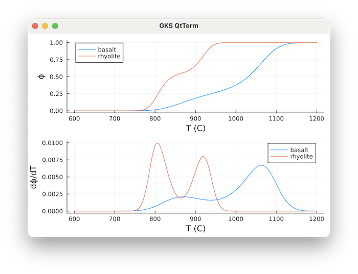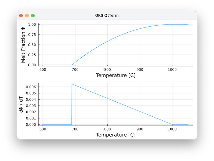 julia> T_s,phi_s,dϕdT_s = PlotMeltFraction(p_s,T=T);We can create plots of this with: