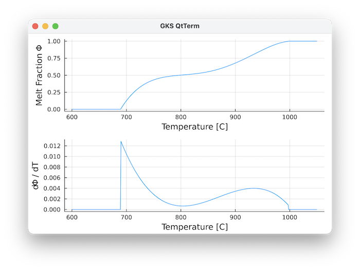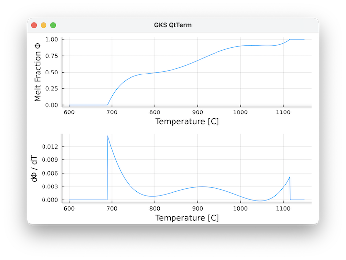 julia> T_s,phi_s,dϕdT_s = PlotMeltFraction(p_s,T=T);We can create plots of this with:
