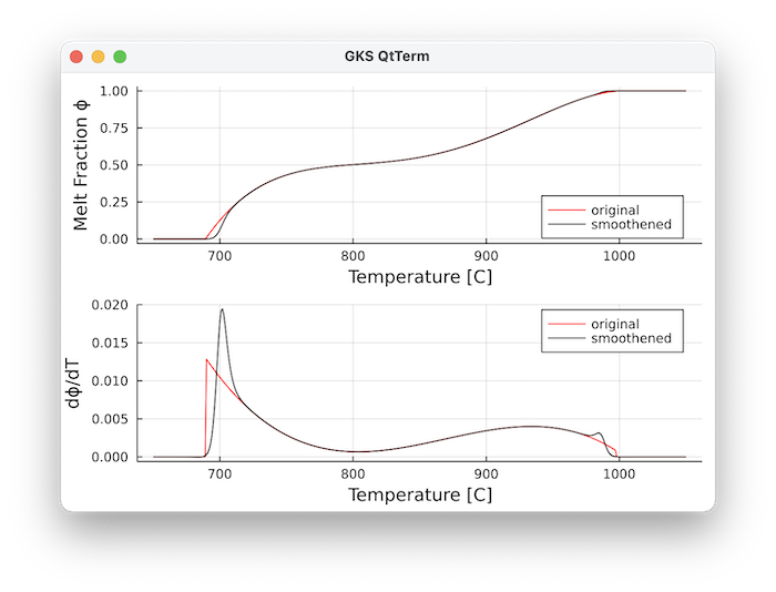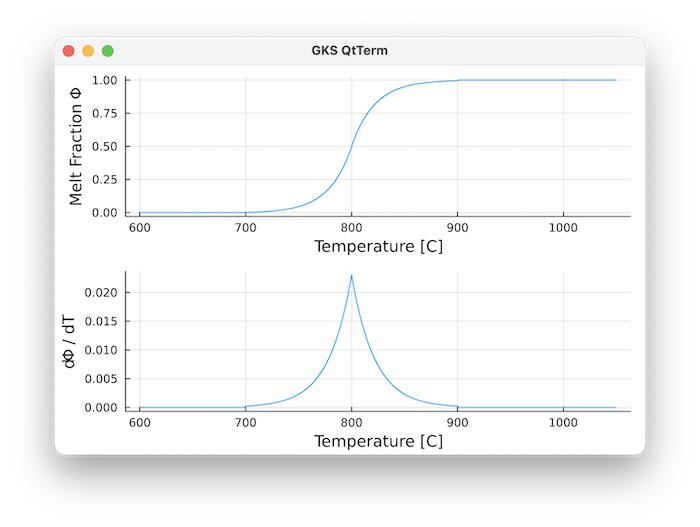 julia> T,phi,dϕdT = PlotMeltFraction(p,T=T);The same but with smoothening: