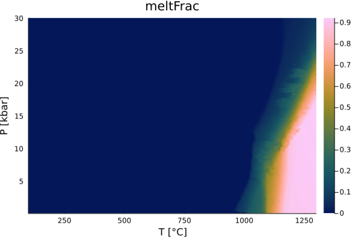 julia> PlotPhaseDiagram(PD_data,:meltFrac, Tvec=(100:1:1400).*C, Pvec=(.1:.1:30).*kbar )This will generate the following plot