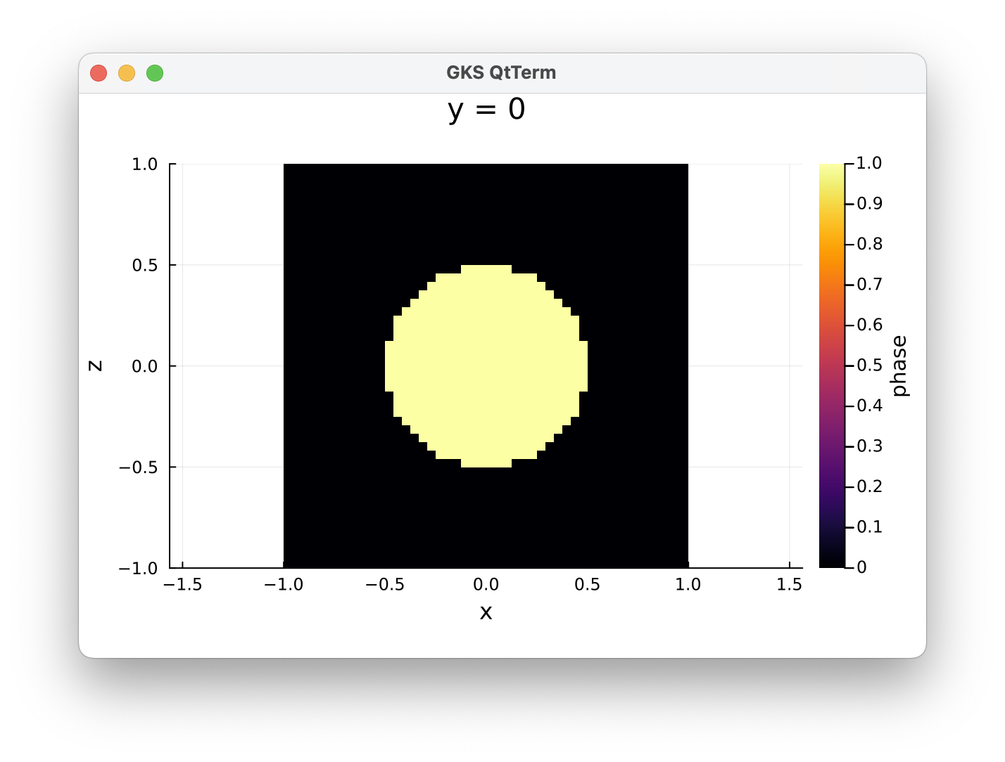 julia> add_sphere!(model,cen=(0.0,0.0,0.0), radius=0.5)It is often useful to plot the initial model setup. You can do this with the heatmap function from the Plots.jl package, for which we provide a LaMEM plugin that allows you to specify a cross-section through a 3D LaMEM setup: